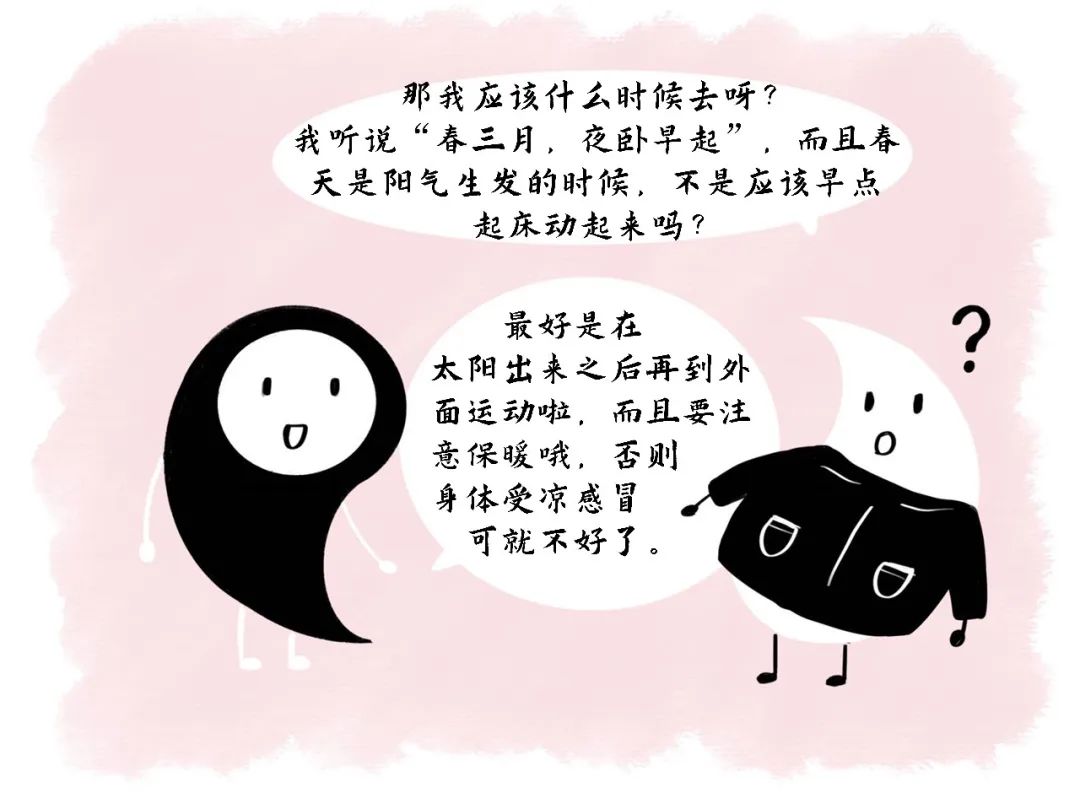 春季运动时要注意防寒保暖, 早春时节, 乍暖还寒,气温较低,容易受凉感冒。春季气候较为干燥, 加上运动出汗, 应该及时补充水分。