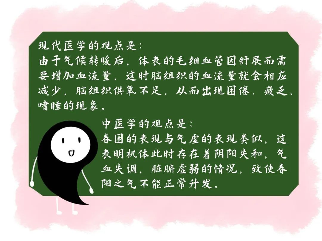 春日渐暖, 本来人们应该表现出精力充沛、活泼好动的特点,但很多人出现了困倦、疲乏、昏昏欲睡的表现, 人们称之为“春困”。