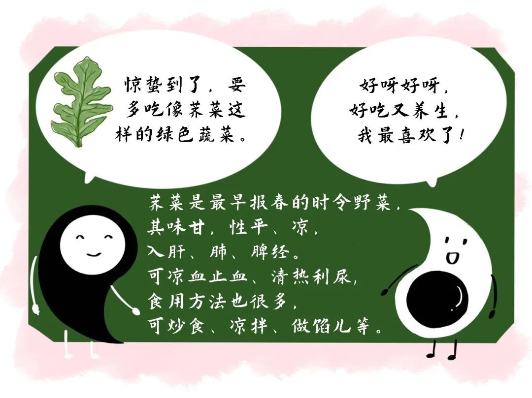 惊蛰以后, 野菜陆续上市。野菜营养丰富, 有些本身就是药材, 多食有益健康。绿色属木,与肝脏相应,荠菜、茼蒿、薄荷等绿色蔬菜既可以促进肝气的疏泄,又可以清肝热,防止春季火热上炎。同时还要注意减少摄入温热性太强的食物,如辣椒、芥末、牛肉、羊肉等,麻辣火锅也要少吃。
