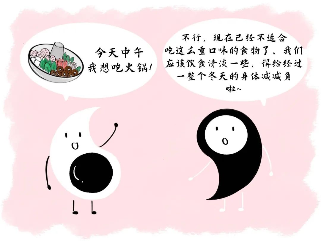 《黄帝内经》对阴阳平和协调的关系, 以“阴平阳秘, 精神乃治”来表述,意思是说阴精宁静不耗, 阳气固密不散, 阴阳双方保持动态平衡, 才能使人精神旺盛, 生命活动正常。春分是大自然赋予人们阴阳平和的状态, 因此要顺应节气保持良好的心态, 不急不躁, 不卑不亢, 保证充足的睡眠, 愉悦地工作。