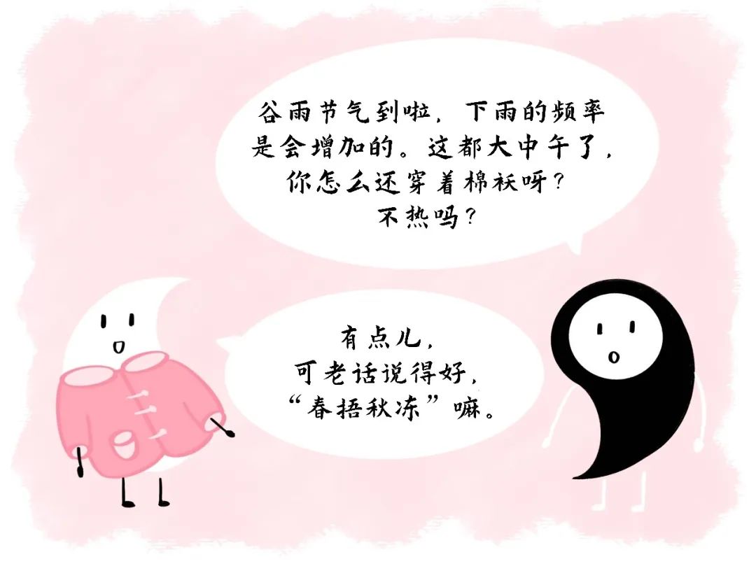 我国古代把谷雨分为三候:“第一候萍始生;第二候呜鸠拂其羽;第三候为戴任降于桑。”意思是说,谷雨后,雨水增多,浮萍开始生长,布谷鸟的叫声提醒人们播种,桑树上出现戴胜鸟。常言道:“清明断雪,谷雨断霜”,谷雨后雨量增多,气温回升,这个时节是农作物及时耕种的好时机,人体的阳气也随气温上升而渐渐隆盛。