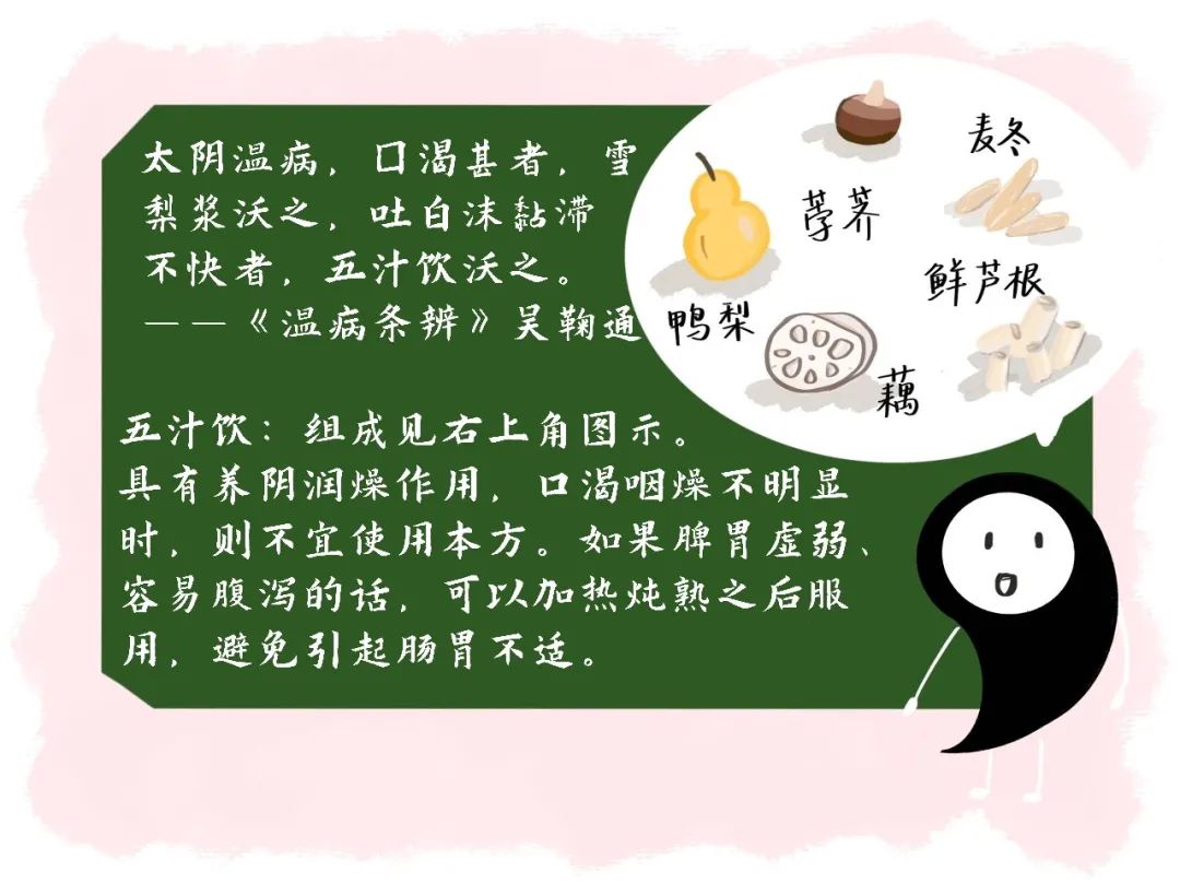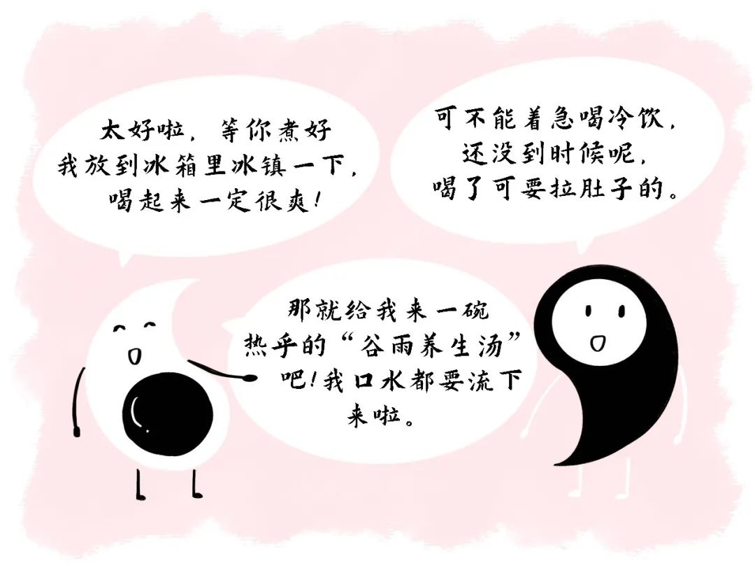 清代名医吴鞠通在《温病条辨》中写到:太阴温病,囗渴甚者,雪梨浆沃之,吐白沫黏滞不快者,五汁饮沃之。注:此皆甘寒救液法也。后人常称五汁饮为谷雨养生汤。其中的五汁指的就是梨汁、荸荠汁、藕汁,麦冬汁和鲜芦根汁。谷雨时节温度升高,很多人都想饮用冷饮、吃冰淇淋来摆脱夏天的燥热。与其食用那些刺激肠胃的冷饮,不如喝一碗滋阴生津的五汁饮,消暑解渴,好不快活!