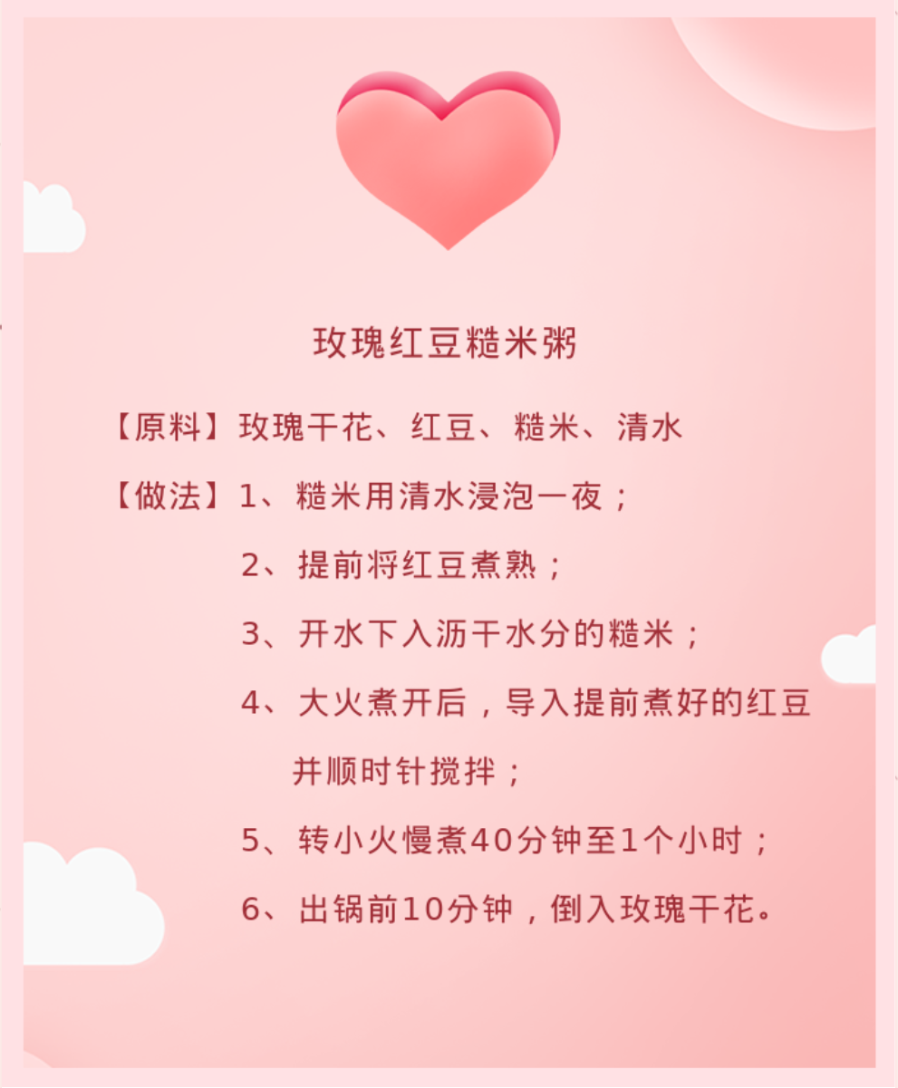 中医认为,玫瑰理气活血,红豆利水消肿,此粥则有调节情绪,改善脸色暗沉,缓解水肿之效。西方爱情象征的玫瑰,中国“相思寓意”的红豆,都融在这一碗的情意满满的玫瑰红豆糙米粥里,情人节即将到来之际,为身边的 Ta 动起手来吧!