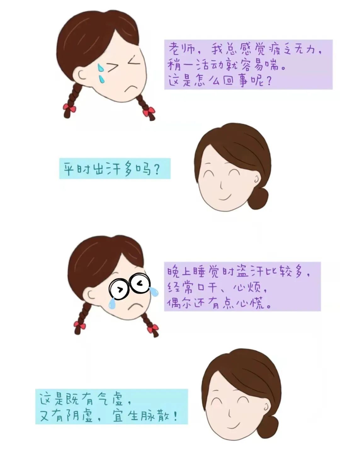 温热、暑热,耗气伤阴证。汗多神疲,体倦乏力,气短懒言,咽干口渴,舌干红少苔,脉虚数。