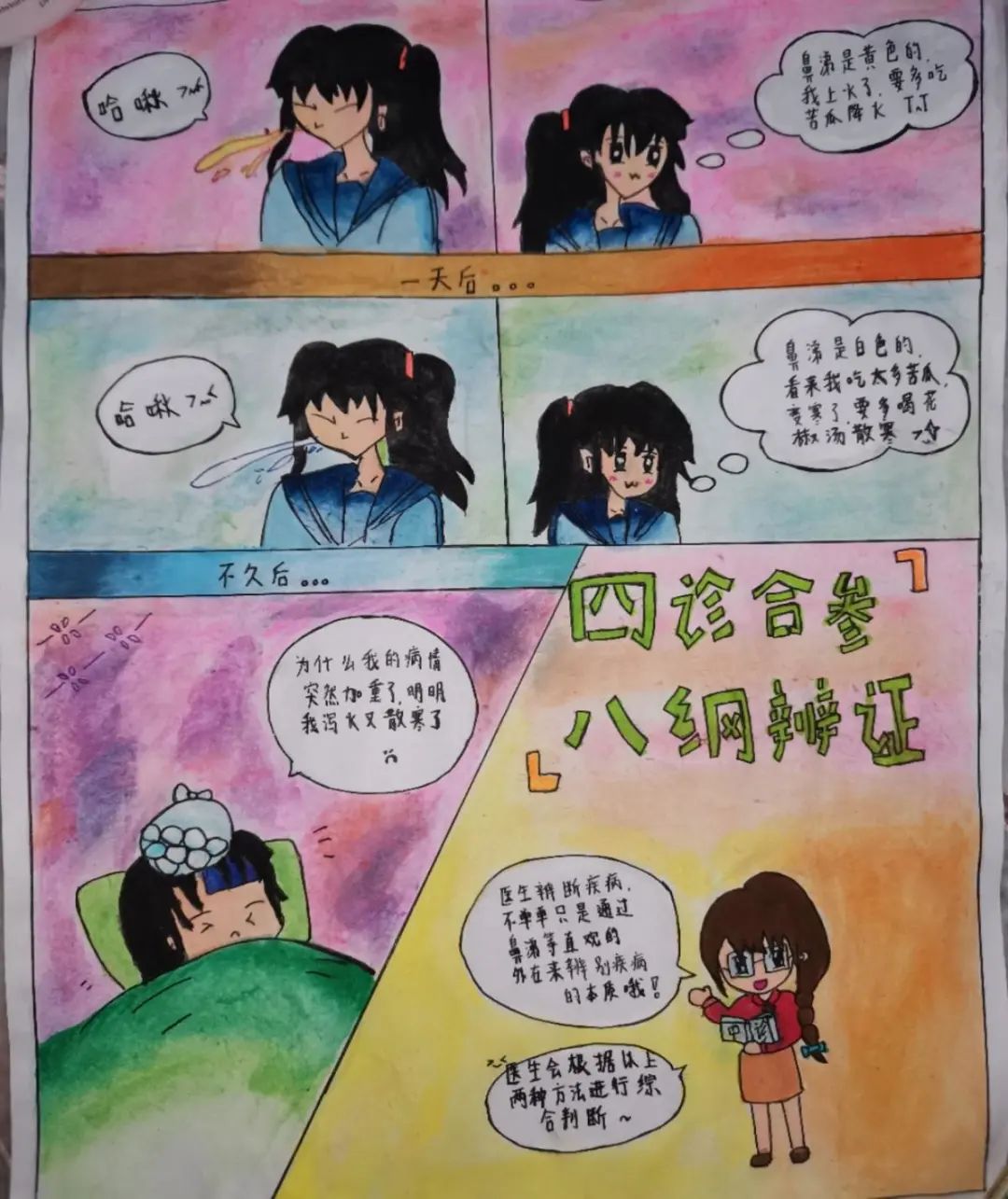 (图中的小女孩自行通过判断症状,导致病情加重。希望民众可以借此明白全面了解中医知识的重要性,不要一知半解就运用,以防带来严重的后果)